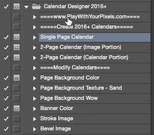 Once the calendar page is created, you can modify the background, personalize the title and copyright, change the banner color and much more. Each month is included in the file as a separate layer so once you create the page, you can change the month by simply turning layers on and off.
