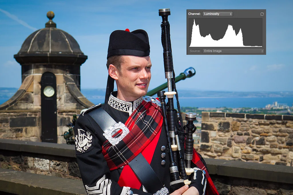 The portion of the graph that is close to - but not touching - the left side illustrates the dark tones in the image. His black uniform, the pipes and even the black door behind him are all included in this end of the histogram. By exposing the image so that these dark tone elements don't push up agains the side wall of the histogram, I've made sure to keep details in all these areas.