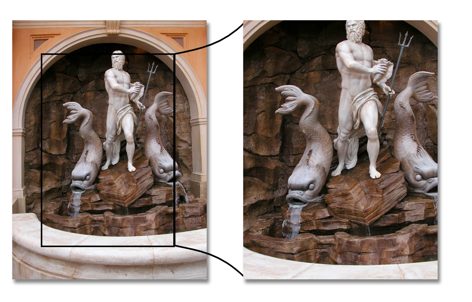 For most photographers, when we talk about focal length we talk in terms of using a lens on a 35mm film camera, but the magnification of a lens changes depending upon the digital sensor size in the camera. For example, look at the images of Poseidon. The image at left illustrates the magnification of a lens using a full frame sensor or 35mm film.