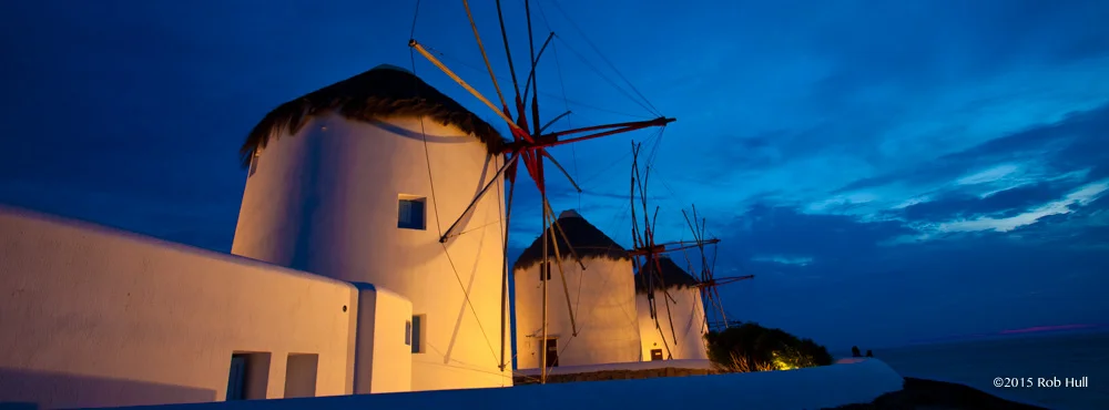 A wide angle lens captures the windmills and the twilight sky in Mykonos, Greece.