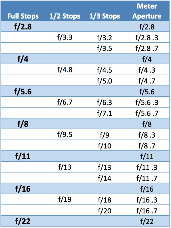 Most light meters will give you aperture readings in 1/10 increments. To help you translate that to a working aperture you can find the Meter Aperture Readings in the table in the far right column.