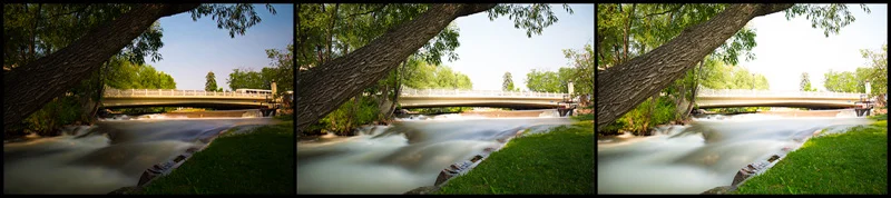 Here is a set of three images shot of Boulder Creek. In post processing, I can use an HDR tool to merge the images together to create one high dynamic range image.