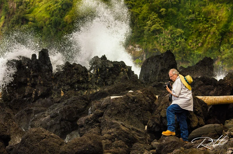 Tony photographing the rugged coast at Laupahoehoe Beach Park on the windward side of the Big Island.